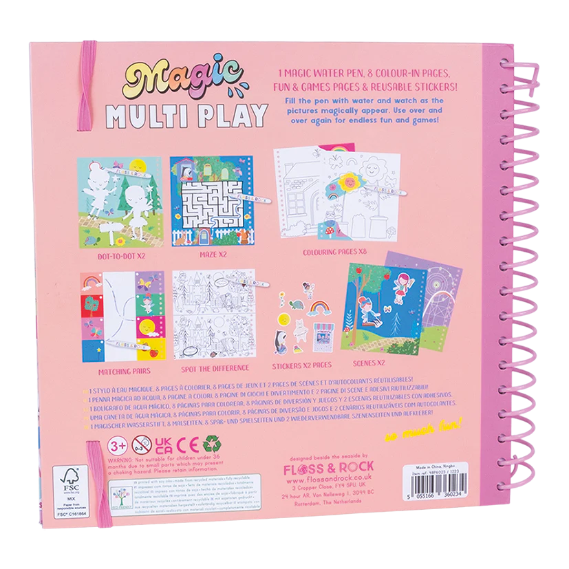 Er valt zoveel plezier te beleven met onze Magic Multi Play, boordevol herbruikbare activiteiten. In het spiraalgebonden boek vind je 8 pagina’s om in te kleuren, 2 dot-to-dot pagina’s, 2 doolhofactiviteiten, paren vergelijken, zoek het verschil, 2 pagina’s met herbruikbare stickers en 2 scènes om te versieren! Net als bij onze razend populaire Magisch Water-reeks vul je de bijgeleverde pen met water en zie je hoe de afbeeldingen op magische wijze verschijnen. Gebruik hem keer op keer en als het spelen voorbij is, gebruik je de elastische sluiting om alles netjes bij elkaar te houden voor de volgende keer.