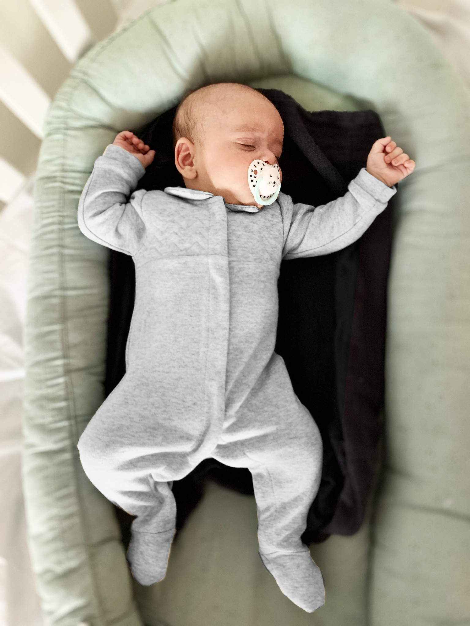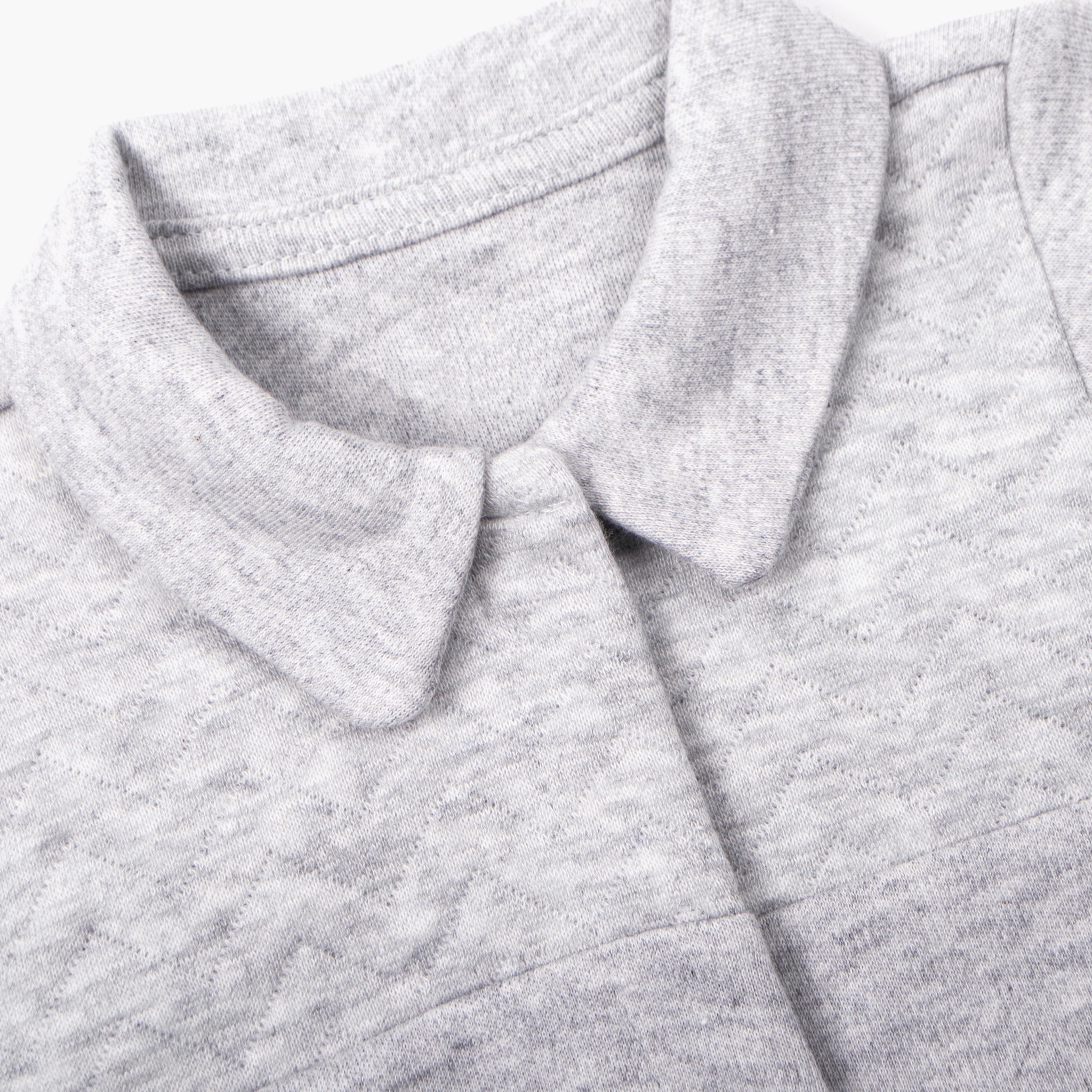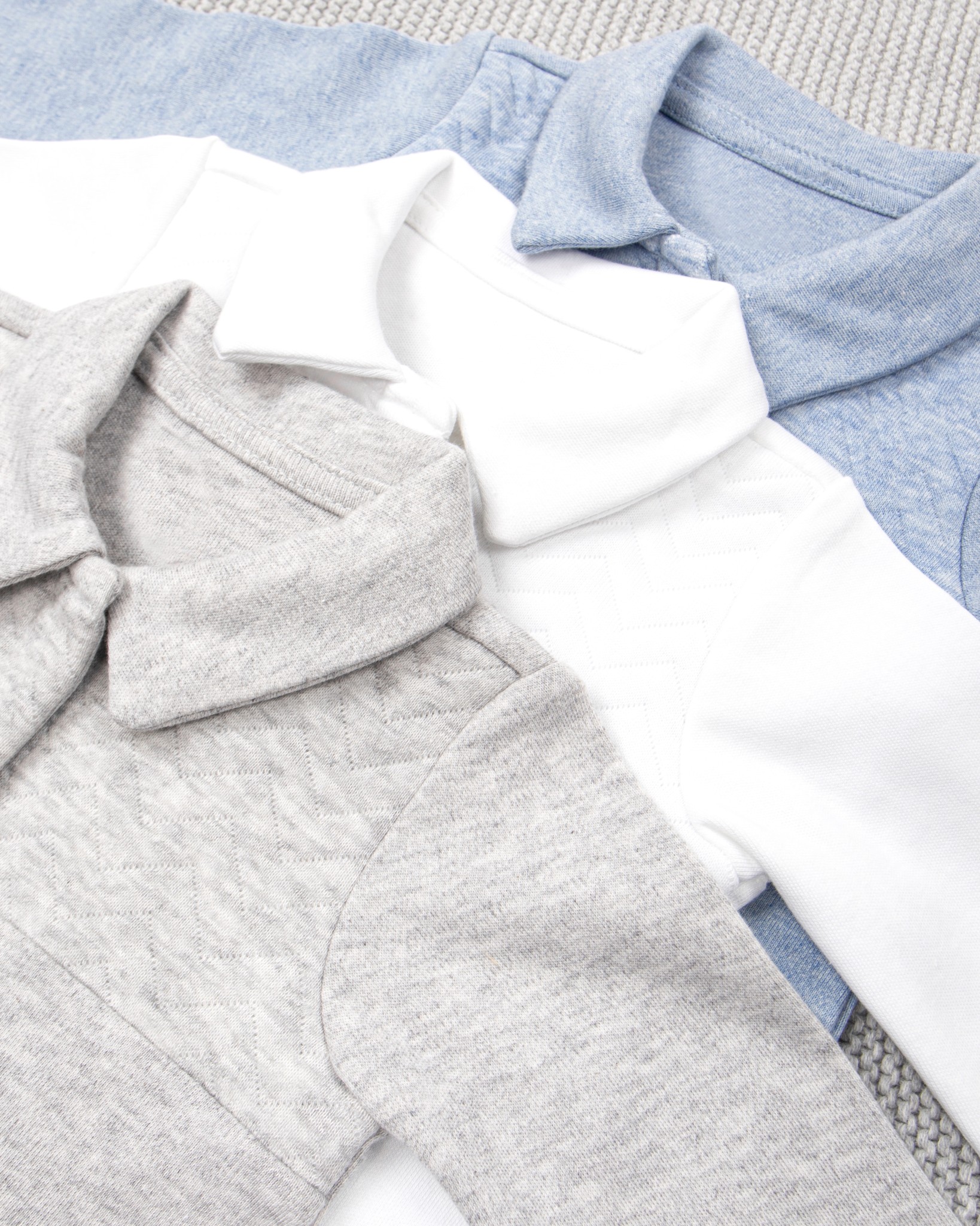 Dit babypakje gemaakt van zacht jersey heeft aan de voorzijde van het pakje en onderaan de voetjes een zig-zag patroon.