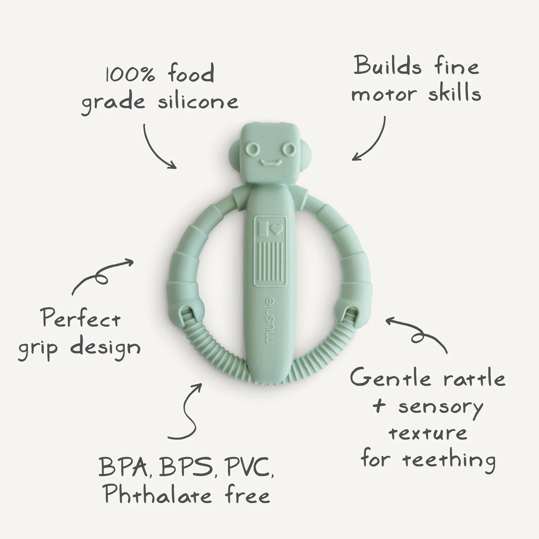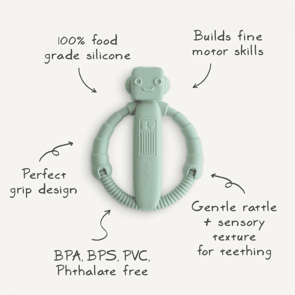 Geïnspireerd door technologie en ontworpen met functionaliteit en comfort in het achterhoofd, heeft onze siliconen robot rammelaar een speelse robotvorm en ingebouwde rammelaar. Het vrolijke geluid stimuleert de auditieve zintuigen van baby voor extra verlichting.