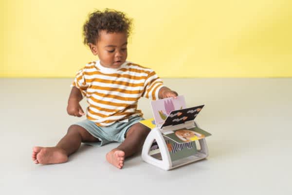 Een dubbelzijdig, draaiend babyboek voor 3 ontwikkelingsstadia met zowel zwart-wit illustraties als kleurrijke illustraties. De ene kant is perfect voor baby’s vanaf 0 maanden: de contrastrijke tekeningen zorgen ervoor dat de baby zich op één beeld tegelijk concentreert en helpt baby’s zintuigen en emotionele intelligentie te ontwikkelen. De andere kant heeft rijke kleuren en is ideaal om rechtop of op de buik te spelen. Het draaien van de pagina’s maakt een ratelend geluid, zo leert de baby over oorzaak en gevolg!