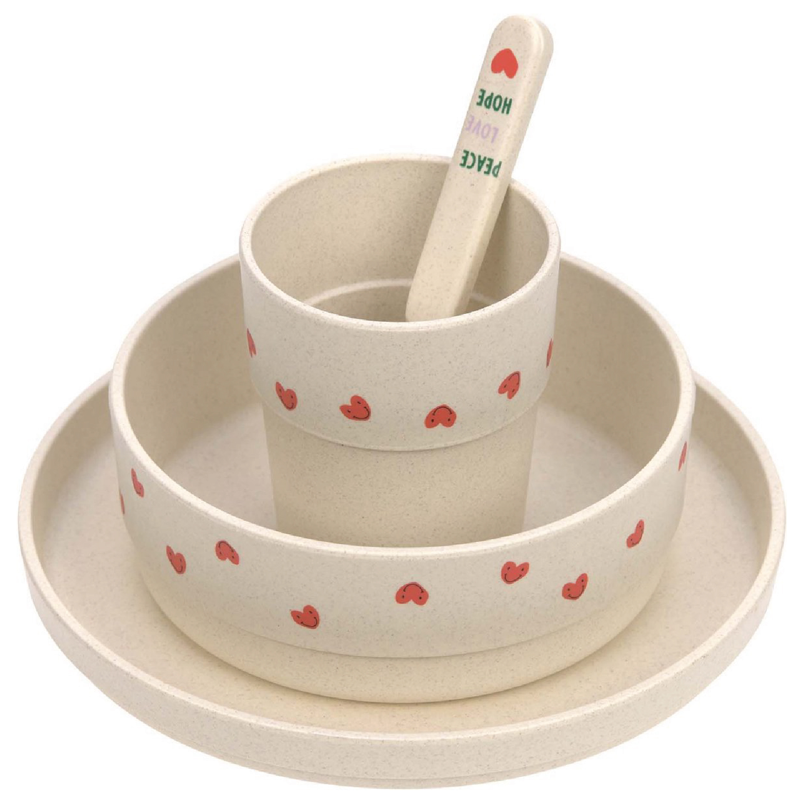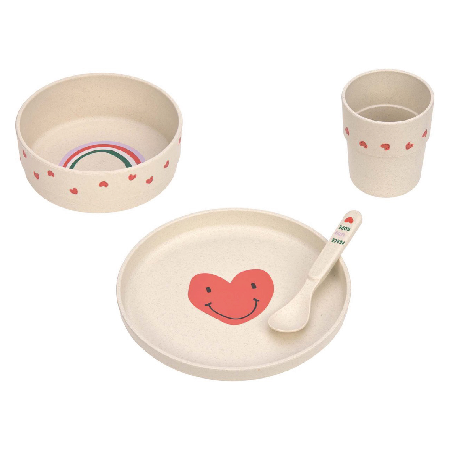 De kinder eetset is ideaal voor kinderen vanaf 12 maanden en is voorzien van praktische eigenschappen, aantrekkelijke ontwerpen en duurzame materialen. Het kinderservies is BPA-vrij en licht van gewicht. De eetset nodigt kleine fijnproevers uit om kennis te maken met leukste kleuren. Praktische details en aantrekkelijke prints maken zelf eten kinderspel. De set bestaat uit een bord, kom, beker en lepel. Om ervoor te zorgen dat het servies goed op tafel blijft staan, is aan de onderkant een siliconen antislipring aangebracht. Het kinderservies is BPA-vrij, licht van gewicht en vaatwasmachine- en magnetronbestendig. Het is gemaakt van een mengsel van polypropyleen en cellulose, dus duurzamer en grondstofzuiniger dan conventioneel polypropyleen.
