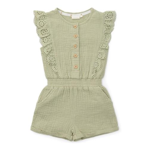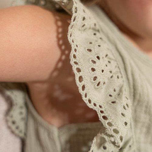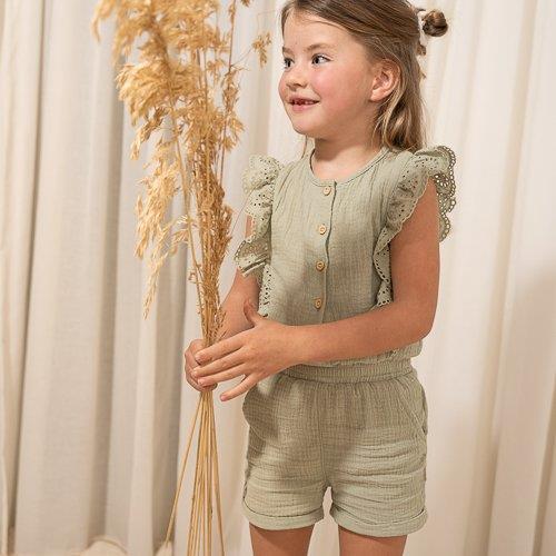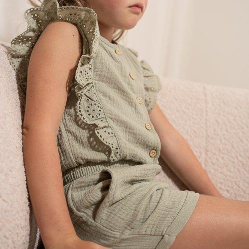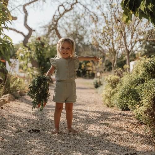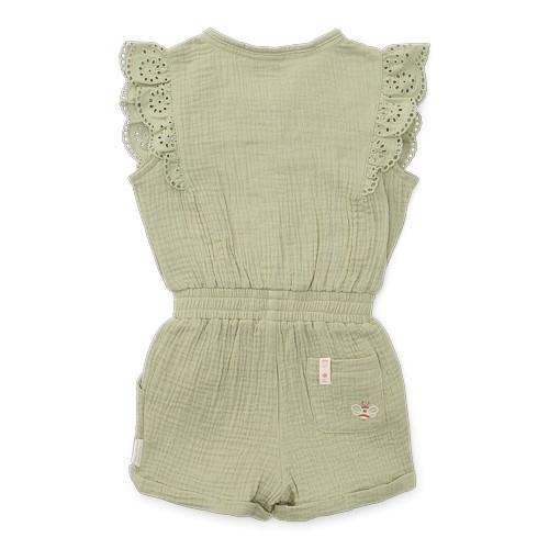 Groen, groener, groenst! Deze vrolijke groene mousseline jumpsuit van biologisch katoen is heerlijk zacht en luchtig om te dragen. De elastische tailleband zorgt ervoor dat je de jumpsuit gemakkelijk aan en uit kunt trekken. De jumpsuit is verrijkt met schattige broderie ruches, een vrolijk borduursel op de achterzak en fijne houtlook knoopjes. Onze bijpassende scrunchies en haarbandjes maken de outfit van je kindje helemaal af. Alle items uit de Little Farm collectie kunnen met elkaar gecombineerd worden zodat je je kind gerust een eigen outfit kan laten samenstellen