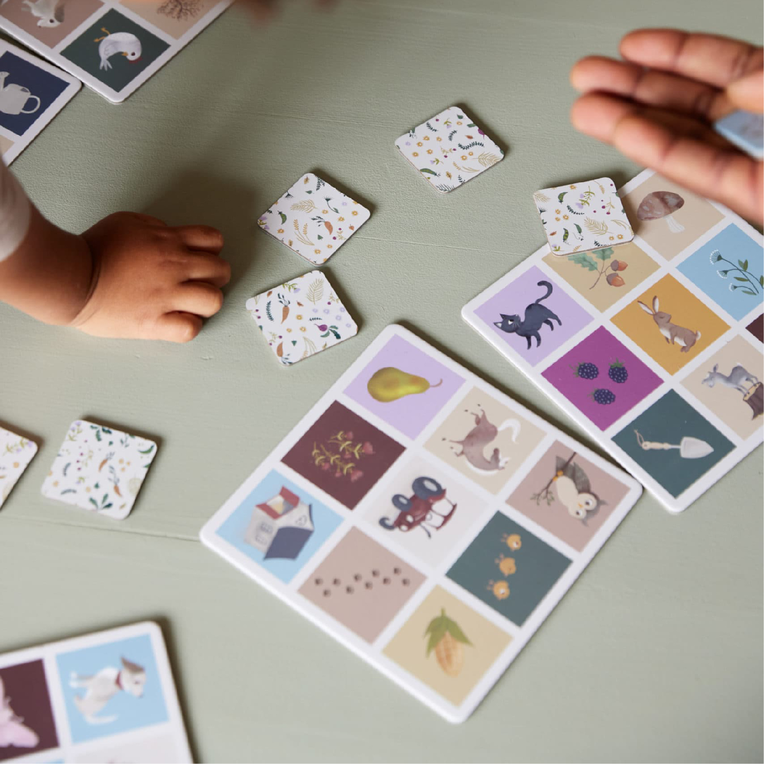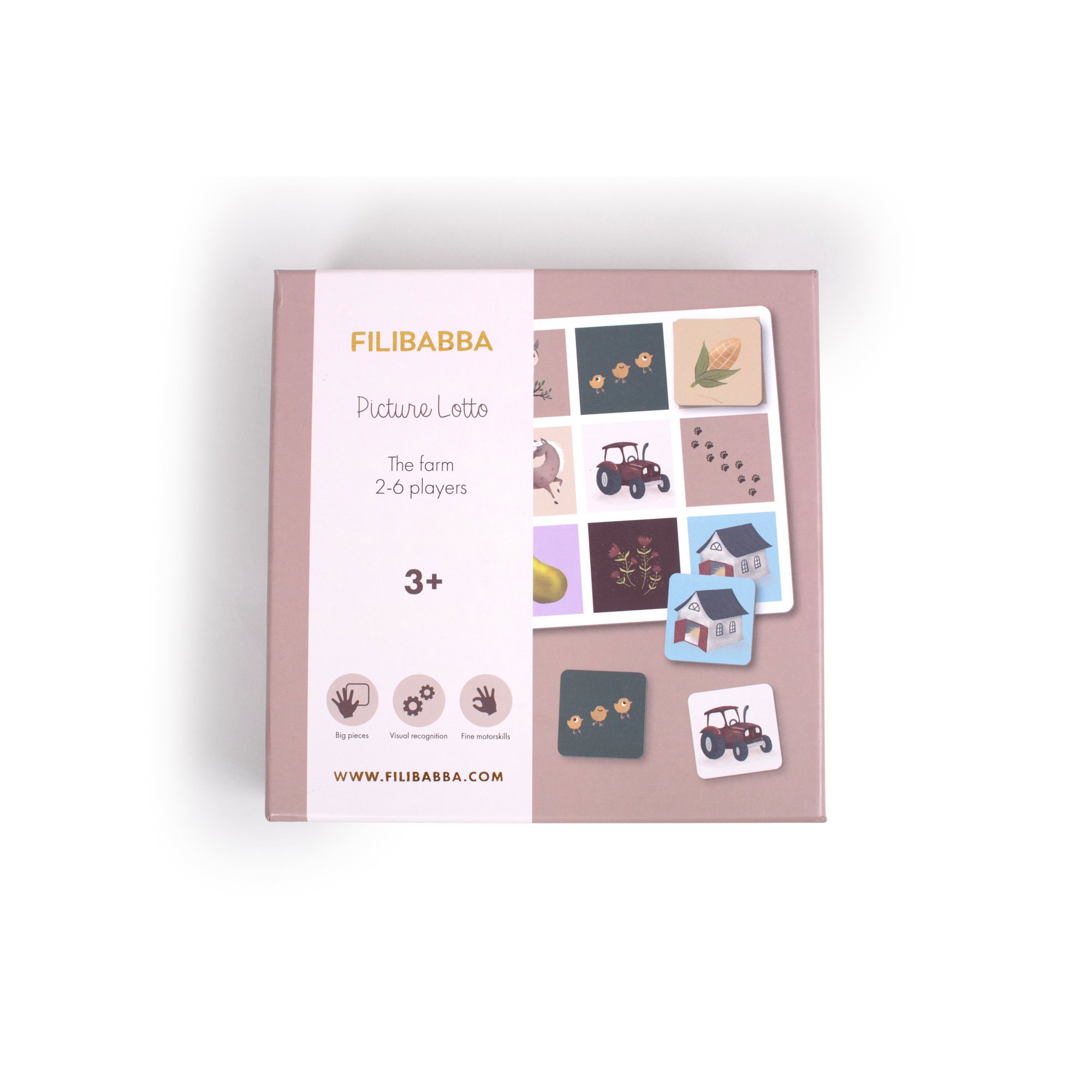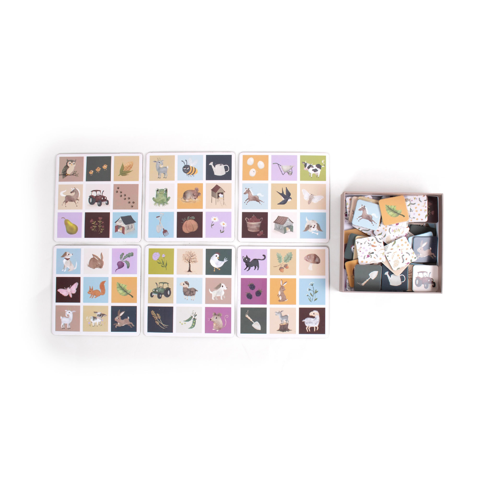 Het prentenloterijspel bevat 6 borden en 54 speelstukken met kleurrijke handgetekende illustraties van schattige dieren en geliefde elementen uit het boerenleven.