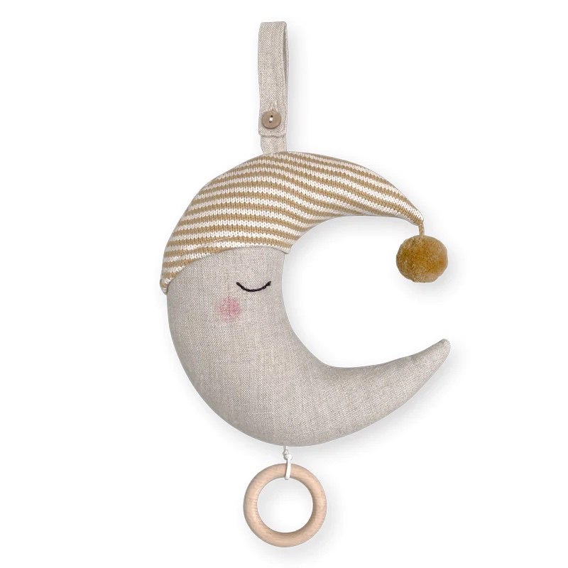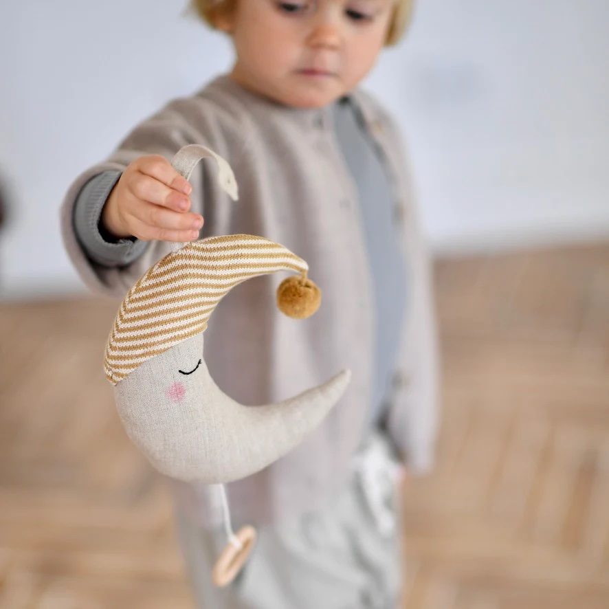Deze prachtige muziekmobiel “Luna” heeft de vorm van een maantje, met een schattige gebreide muts op. De mobiel speelt de traditionele melodie van een slaapliedje en is een schattig accessoire voor iedere baby- of kinderkamer.
