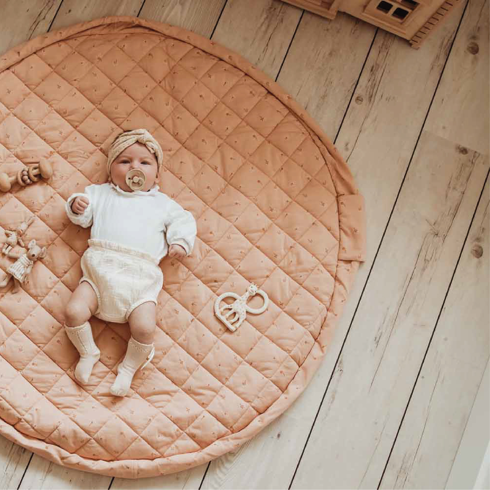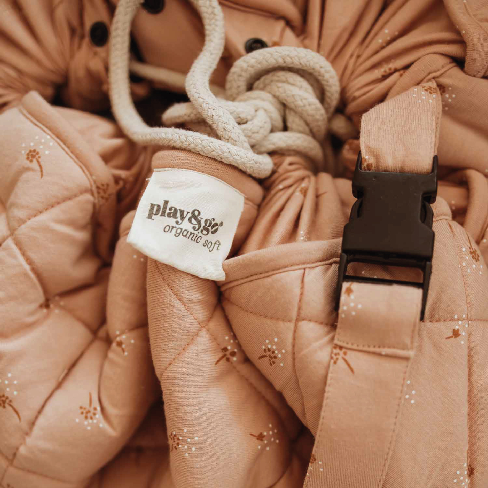 Maak kennis met de biologische 3-in-1 babymat, opbergtas en luiertas in de betoverende Fleurie-print.
