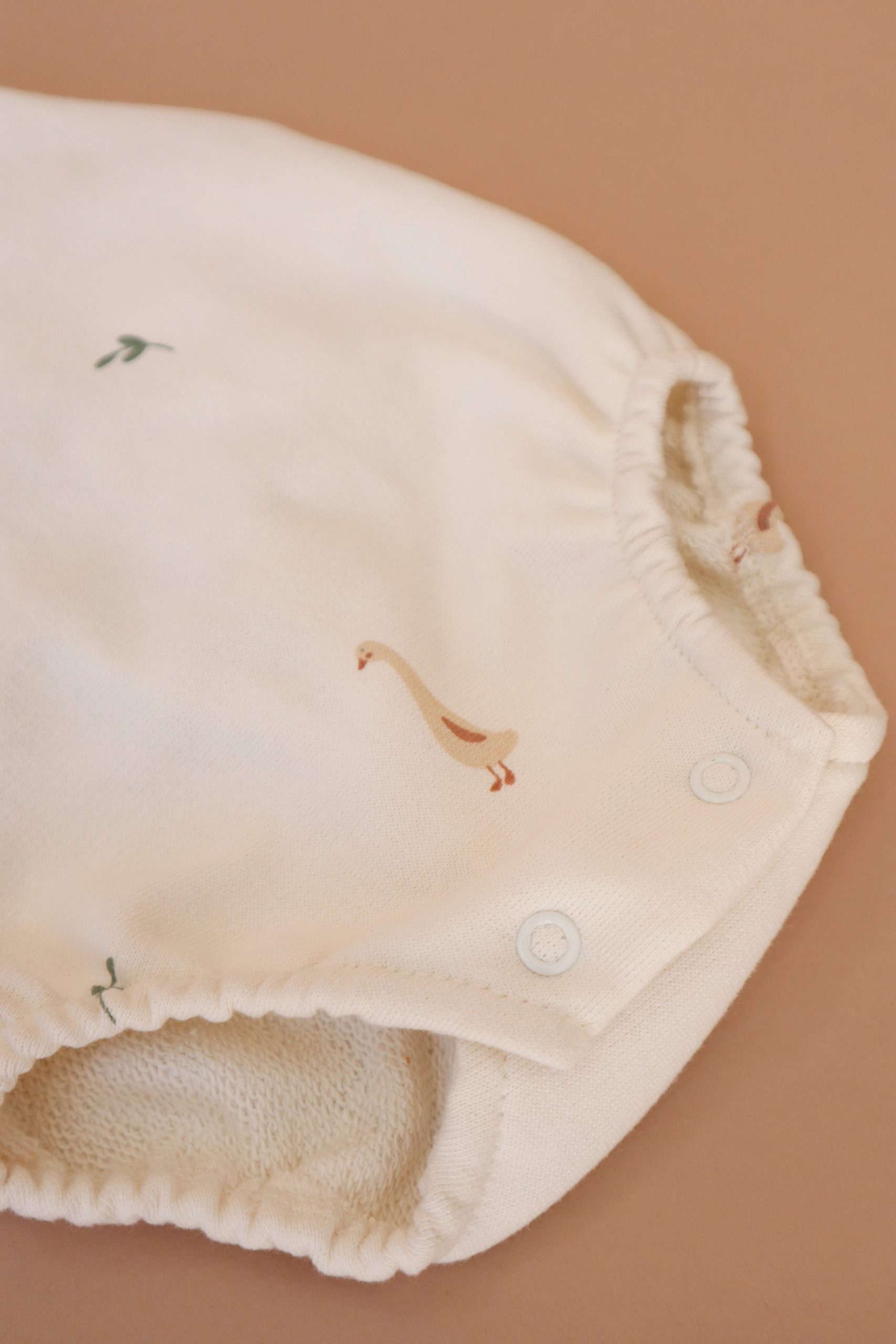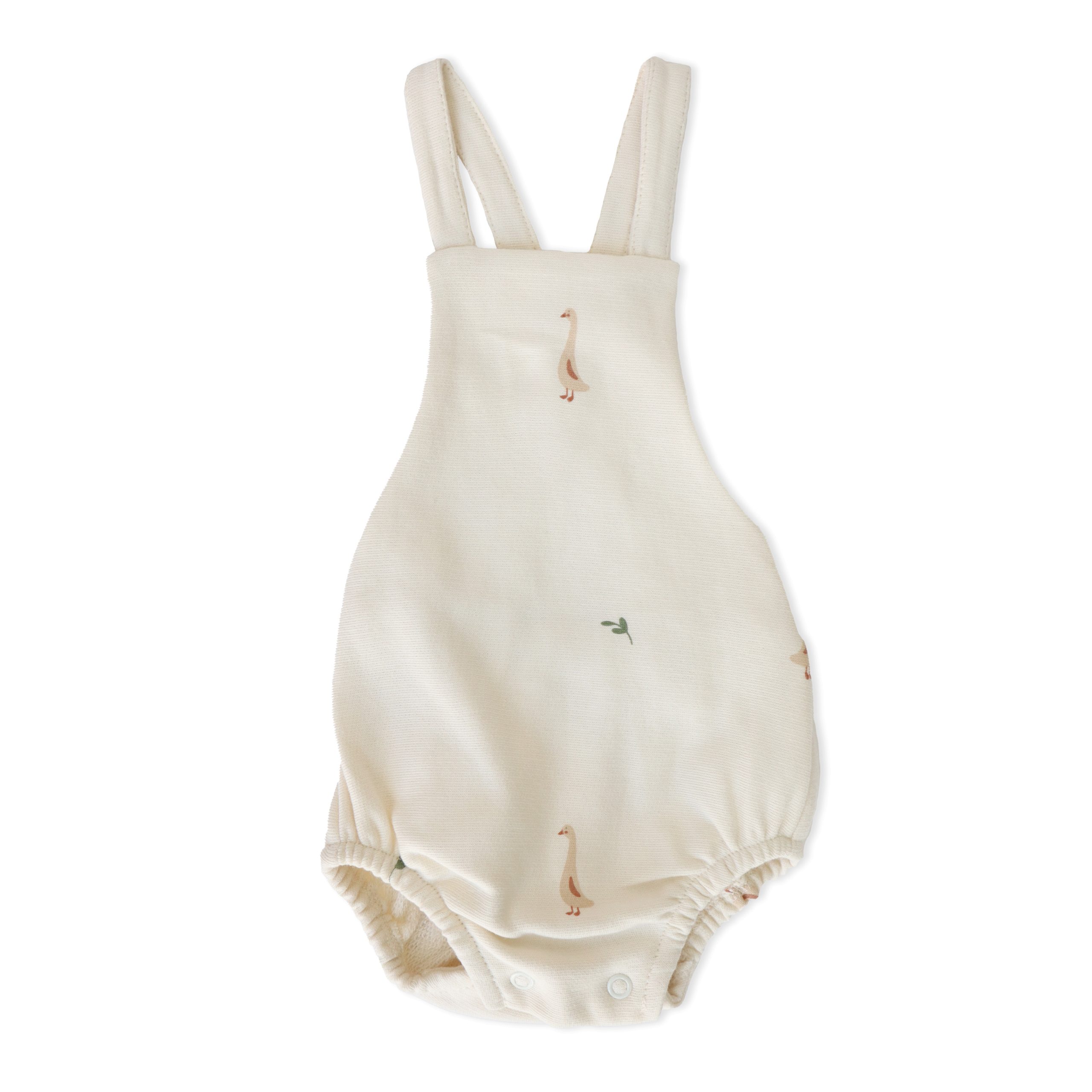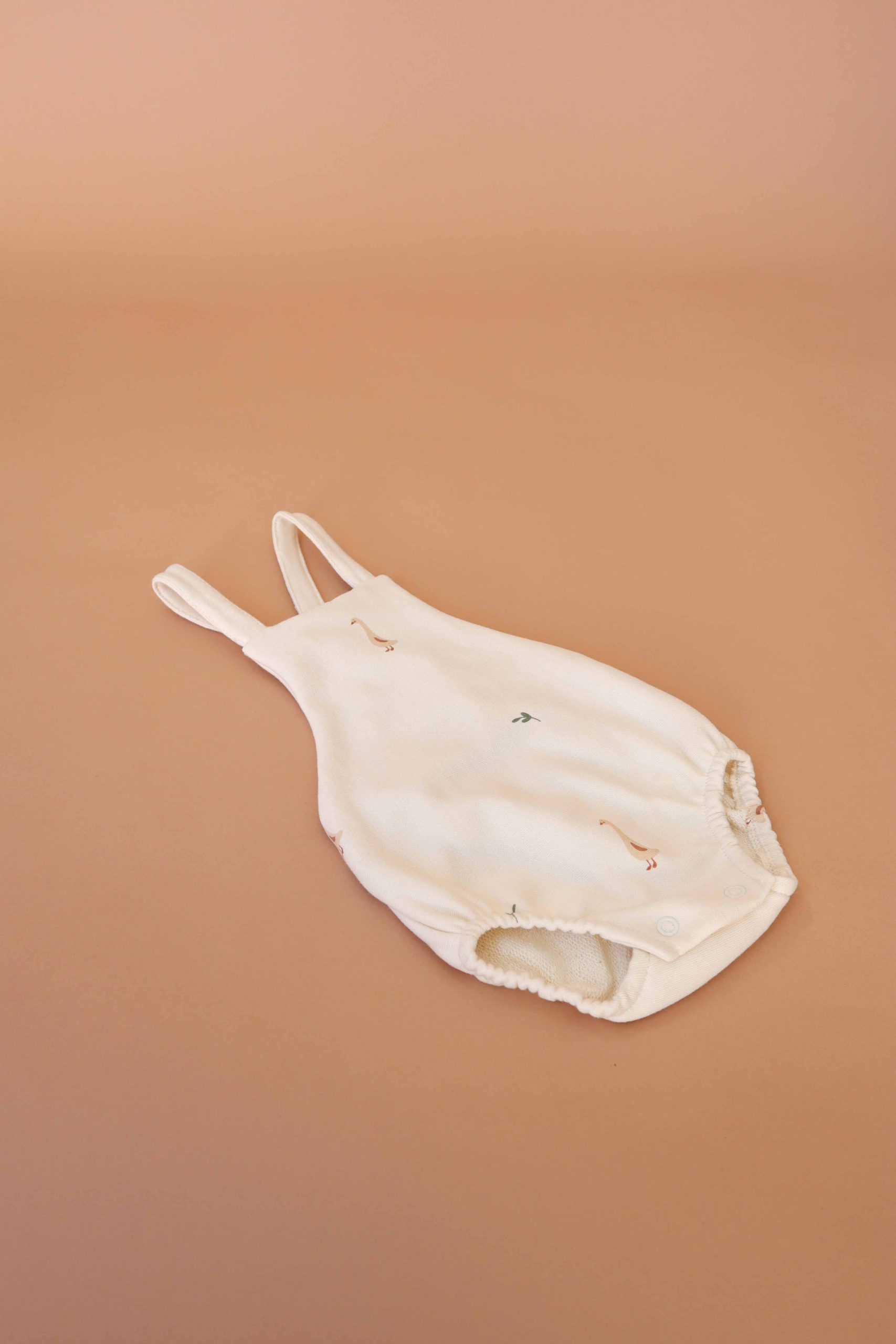 Korte salopette van biologisch katoen, vierkante halslijn, drukknoopjes onderaan. Gekruiste bandjes met drukknopen op de rug voor gemakkelijk aankleden.