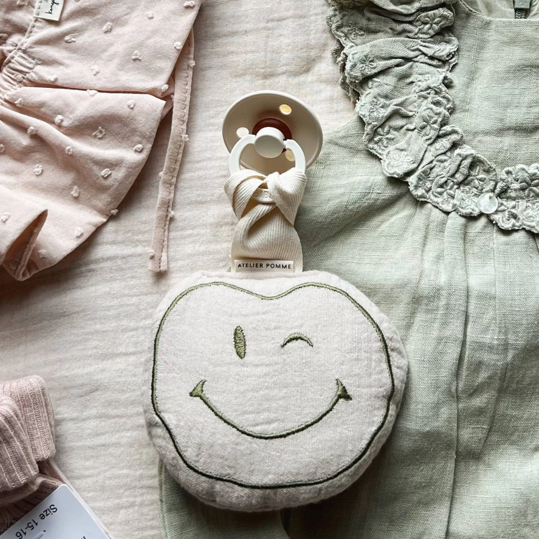 Hallo daar, vrolijke vriend! Onze day one happy maker! Dit gezellige appeltje is de POMME CUDDLE, een lieve smiley die de speen van je kleintje bewaakt. Gemaakt zacht mousseline katoen en een koordje waar je een speentje aan kan bevestigen. POMME CUDDLE houdt ook heel erg van knuffelen en doet dat het liefste met jouw baby.