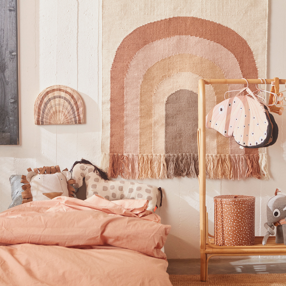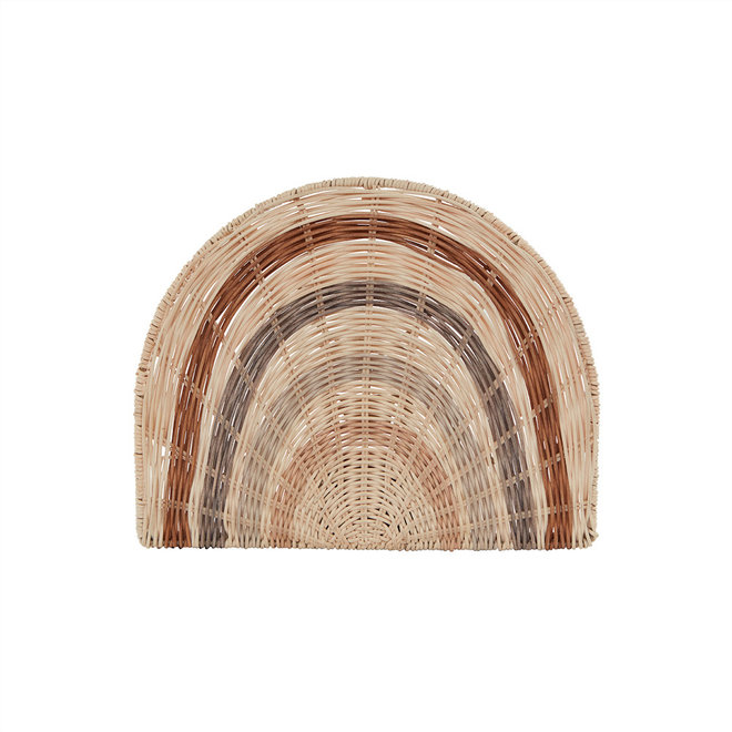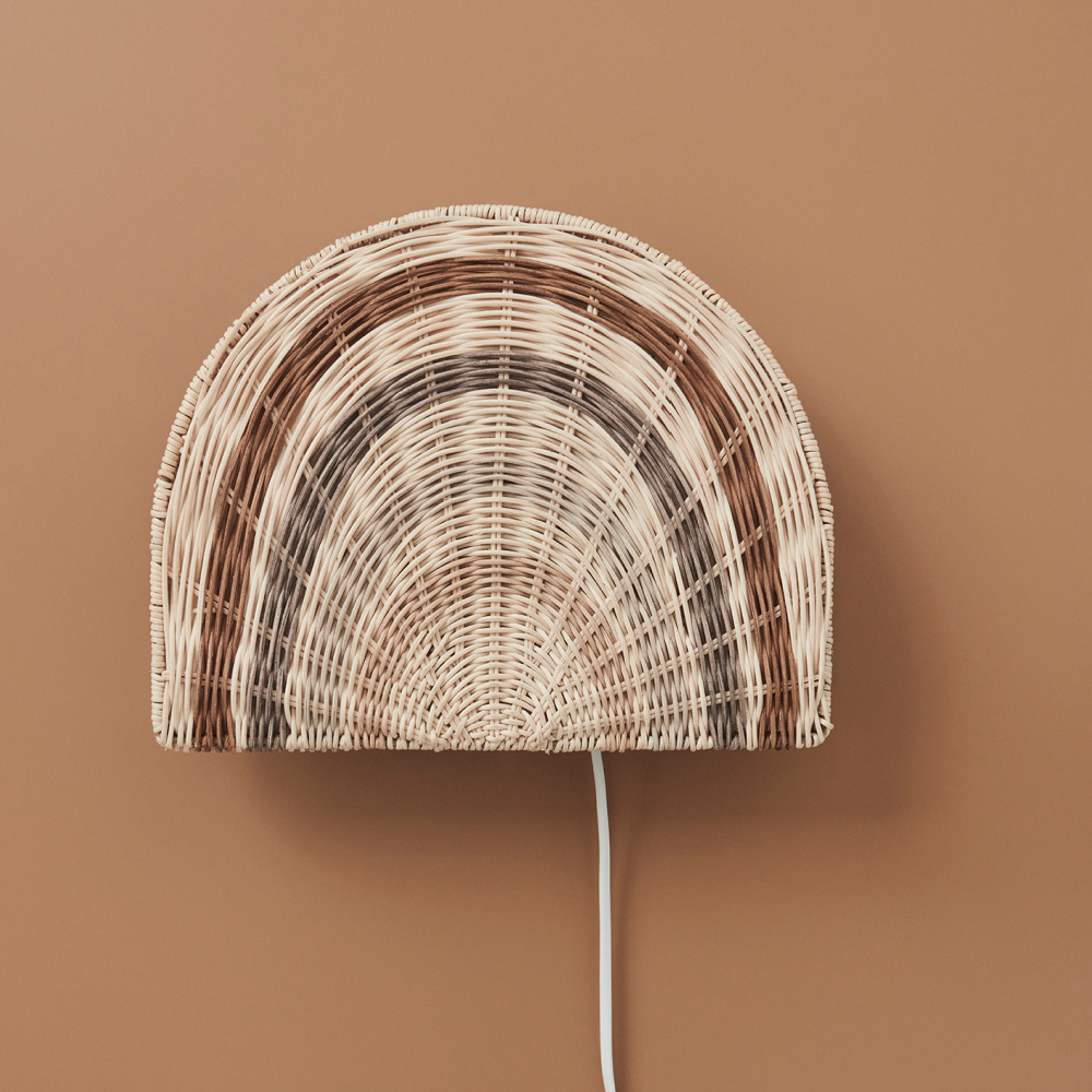 De lamp is met de hand gevlochten in rotan, zodat het licht van de lamp mooi door de regenboog schijnt. De lamp kan bij het bed hangen en licht geven aan het kind tijdens het knuffelen, net zoals hij ter decoratie overal in de kamer kan hangen. Het materiaal creëert warmte en gezelligheid voor de kamer, en met zijn organische vorm geeft de lamp een mooie uitstraling aan de kamer.